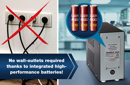 Uudset laboritoiteplokki PeakTech 6200 saab kasutada nii kaasasoleva laadimisadapteri kui ka integreeritud laetavate akude abil, mis võimaldab maksimaalset sõltumatust vooluvõrgust. See pakub suuremat paindlikkust kui võrgutoitega laboritoiteallikad ja tagab ühtlasi suurima elektriohutuse akutoite või III ohutusklassi puutekindla väikepingega.